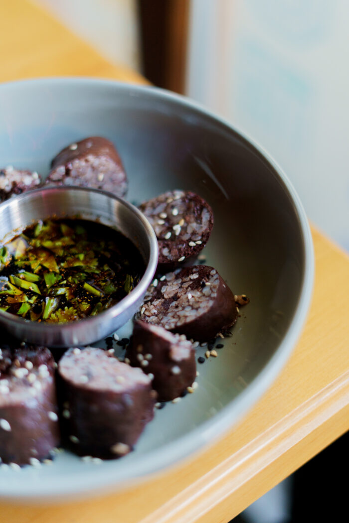 Корейська кров’яна ковбаса з рубленою свининою, рисом і пекінською капустою. Подається з соєвим соусом заправленим часником та кінзою.